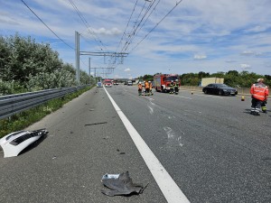 Die Feuerwehr Mörfelden-Walldorf wurde am Donnerstagnachmittag, um 14:16 Uhr zu einem Verkehrsunfall auf der Autobahn 5 in Fahrtrichtung Weiterstadt alarmiert. In Höhe Gräfenhausen fanden die Einsatzkräfte einen auf der Seite liegenden Transporter, der sich mehrfach überschlagen hatte und einen im hinteren Bereich beschädigten LKW-Sattelzug vor.