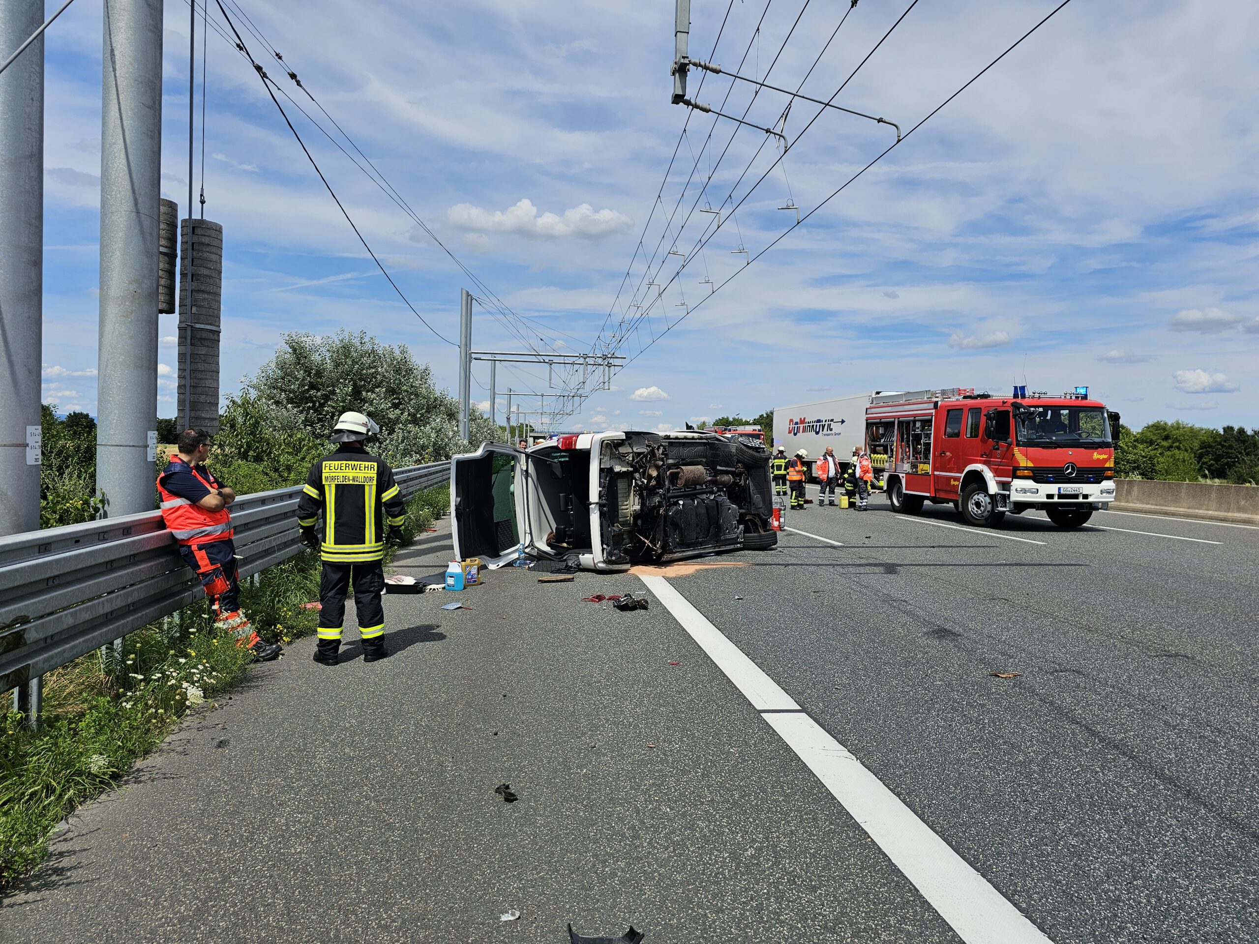 Die Feuerwehr Mörfelden-Walldorf wurde am Donnerstagnachmittag, um 14:16 Uhr zu einem Verkehrsunfall auf der Autobahn 5 in Fahrtrichtung Weiterstadt alarmiert. In Höhe Gräfenhausen fanden die Einsatzkräfte einen auf der Seite liegenden Transporter, der sich mehrfach überschlagen hatte und einen im hinteren Bereich beschädigten LKW-Sattelzug vor.
