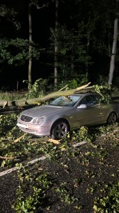 In der Nacht wurden wir auf die B44 Alarmiert, da dort ein Fahrzeug gegen einen umgestürzten Baum kollidiert war und die Person laut Meldung im Fahrzeug eingeklemmt wurde. Vor Ort stellte sich heraus, dass mehrere Bäume auf der B44 umgefallen waren und sich somit die Anfahrt zur eigentlich gemeldeten Unfallstelle verzögerte. An der Unfallstelle angekommen stellte sich heraus, dass der Fahrer nicht eingeklemmt war und sich selbständig aus dem Fahrzeug befreien konnte und bereits vom Rettungsdienst betreut wurde. Aufgrund der weiteren Erkundung der Einsatzstelle stellte die Feuerwehr fest, das neben dem Fahrzeug noch ein Motorrad lag. Auch hier fanden wir keinen Fahrer vor. Aus diesem Grund wurde der umliegende Bereich großflächig mithilfe von Wärmebildkameras abgesucht. Nach kürzester Zeit stellte sich heraus, dass der Motorradfahrer von einem Ersthelfer aus dem Waldgebiet herausgefahren wurde. Der Motorradfahrer wurde anschließend vom Rettungsdienst betreut.