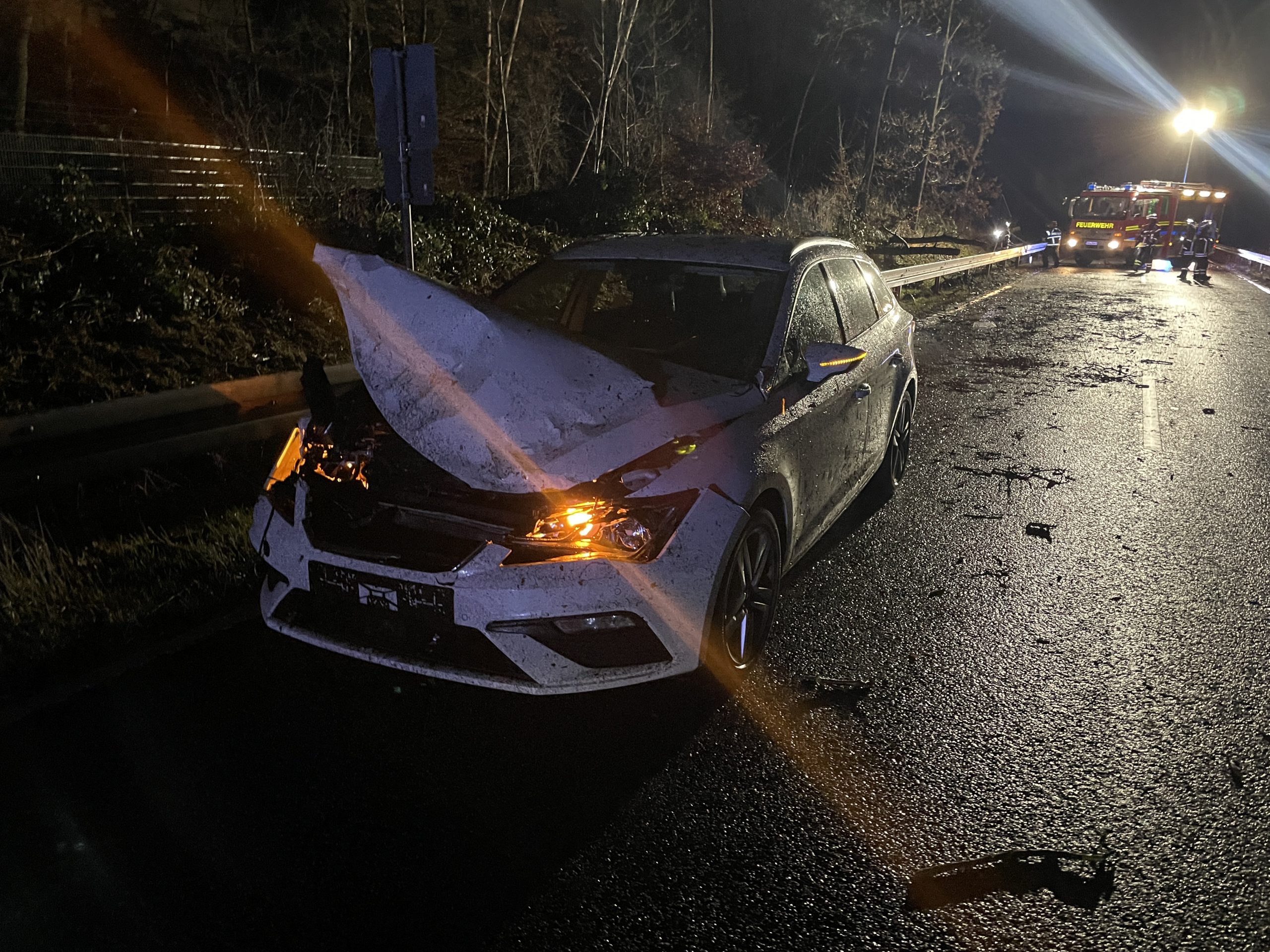Während des Einsatzes stürzte ein weiterer Baum auf der B 44 auf ein fahrendes Fahrzeug. Das Hilfeleistungstanklöschfahrzeug, welches auf dem Weg zum ersten Einsatz war, bemerkte die Unfallstelle und konnte sofort Hilfe einleiten. Der Fahrer wurde glücklicherweise nicht verletzt und konnte das Fahrzeug eigenständig verlassen. Die Feuerwehr sperrte die B 44 und entfernte den umgestürzten Baum. Außerdem musste eine weiterer Baum mithilfe der Seilwinde des HTLF umgeworfen werden, da dieser aus den Wurzeln gerissen und sich beim Umfallen an einen anderen Baum angelehnt hatte. Da der Baum drohte auf die Fahrbahn zu Fallen wurde er durch die Feuerwehr entfernt.