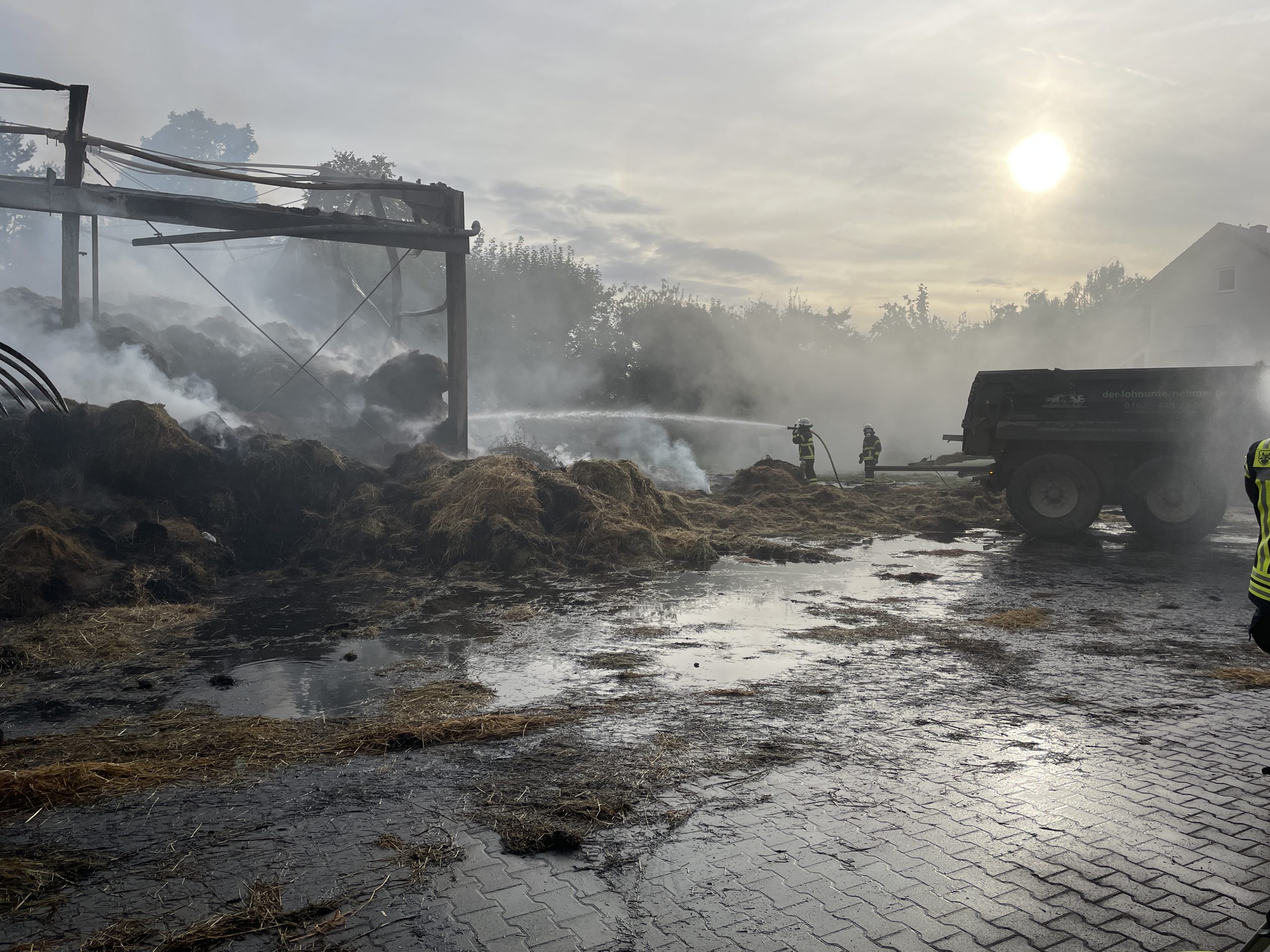 Die Feuerwehr Walldorf wurde am Donnerstag, den 05.10.2023 um 11:09 Uhr nach Egelsbach alarmiert. Dort brannten seit dem Vortag in einer Landwirtschaftlich genutzten Halle ca. 1500 Strohballen. Aus Walldorf wurde eine Löschgruppe mit Atemschutzgeräteträgern alarmiert um vor Ort die Arbeiten zu Unterstützen. Durch Landwirte und Baggerfahrer wurde den ganzen Tag über Stroh aus der Halle herausgefahren und dann von der Feuerwehr abgelöscht. Des weiteren wurden am Abend durch die Feuerwehr Walldorf die Kreisregner aufgebaut und in Betrieb genommen.