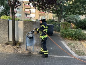 Der dritte Einsatz heute führte uns in die Otto-Hahn-Straße. Dort brannte ein Müllbehälter. Wir löschten den Müllbehälter mit einem C-Rohr ab.