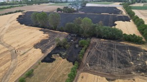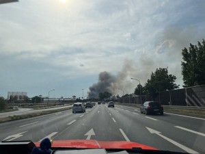 Auf dem Rückweg vom Einsatz auf der BAB 5 nahmen wir eine starke Rauchentwicklung im Bereich der JVA Weiterstadt war. Nach Rücksprache mit der Leitstelle Groß-Gerau stellte sich heraus, dass im Bereich zwischen dem Industriegebiet und der JVA mehrere Hektar Feld und Wiese brannten. Die Leitstelle Groß-Gerau teilte uns sofort mit, dass die Weiterstädter Kollegen bei diesem Brand Hilfe benötigen. Daher machten sich beide Tanklöschfahrzeuge, ein Löschfahrzeug, der ELW und zwei Führungsfahrzeuge auf den Weg zur Brandstelle. Der ELW aus Mörfelden erhielt den Auftrag den Abschnitt des Bereitstellungsraumes zu führen und zu koordinieren. Unsere Tanklöschfahrzeuge und das Löschfahrzeug, sowie ein TLF aus Büttelborn wurden dem Abschnitt West zugeteilt, welchen auch die Feuerwehr Mörfelden-Walldorf leitete. Unser Auftrag bestand darin die westliche Seite abzulöschen. Wir mussten in diesem Bereich auch mehrere Gartenhütten ablöschen.