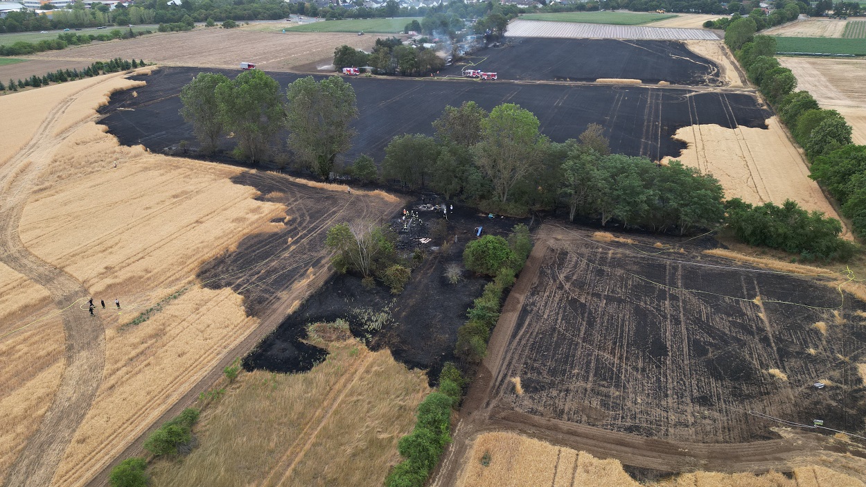 Auf dem Rückweg vom Einsatz auf der BAB 5 nahmen wir eine starke Rauchentwicklung im Bereich der JVA Weiterstadt war. Nach Rücksprache mit der Leitstelle Groß-Gerau stellte sich heraus, dass im Bereich zwischen dem Industriegebiet und der JVA mehrere Hektar Feld und Wiese brannten. Die Leitstelle Groß-Gerau teilte uns sofort mit, dass die Weiterstädter Kollegen bei diesem Brand Hilfe benötigen. Daher machten sich beide Tanklöschfahrzeuge, ein Löschfahrzeug, der ELW und zwei Führungsfahrzeuge auf den Weg zur Brandstelle. Der ELW aus Mörfelden erhielt den Auftrag den Abschnitt des Bereitstellungsraumes zu führen und zu koordinieren. Unsere Tanklöschfahrzeuge und das Löschfahrzeug, sowie ein TLF aus Büttelborn wurden dem Abschnitt West zugeteilt, welchen auch die Feuerwehr Mörfelden-Walldorf leitete. Unser Auftrag bestand darin die westliche Seite abzulöschen. Wir mussten in diesem Bereich auch mehrere Gartenhütten ablöschen.