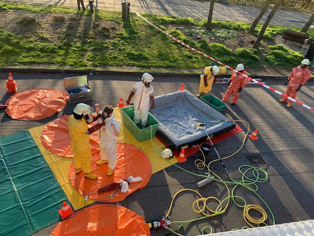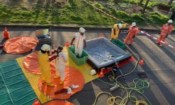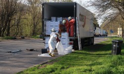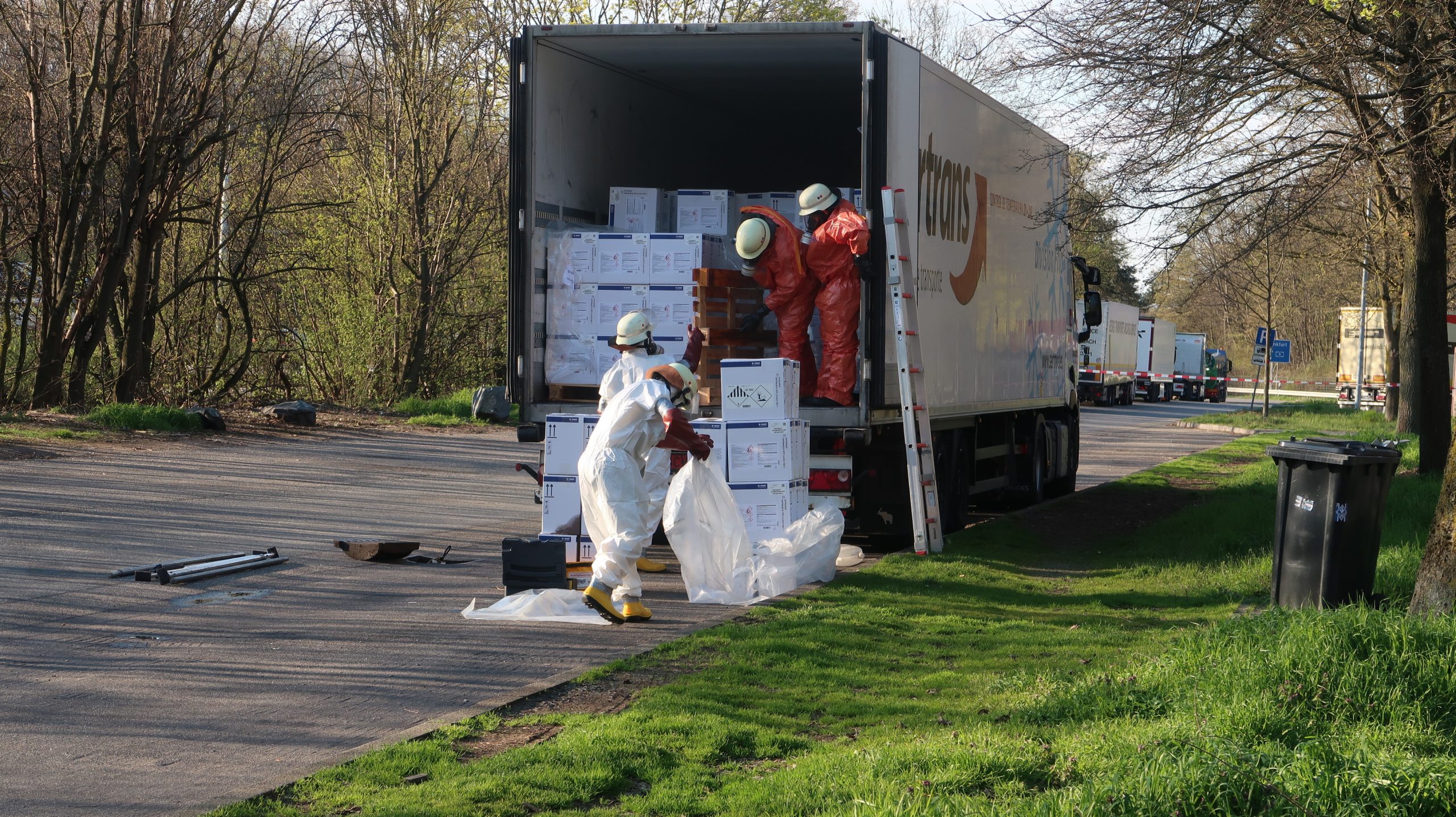 Am Mittwochnachmittag um 16:10 Uhr wurden die Wehren der Doppelstadt, der Fachberater GABC, der GW-ABC-Erkundung aus Trebur, der Kreisbrandmeister, der Organisatorische Leiter Rettungsdienst, der Rettungsdienst und die OV Mörfelden auf einen Autobahnparkplatz alarmiert. Dort hatte ein Sattelzug eine unbekannte Menge an Pflanzenpestizid verloren, welches in die Kanalisation eintrat. Bei Eintreffen der ersten Kräfte wurde die Lage erkundet. Der LKW hatte 900 Gebinde à 2×10 Liter geladen, wovon glücklicherweise nur eines beschädigt war. Da kein weiterer Stoff austrat, beschränkte sich die Arbeit auf die Aufnahme des Gefahrstoffs. Durch 2 Trupps unter leichtem CSA wurde der LKW abgeladen und die havarierte – sowie in Mitleidenschaft gezogene – Fracht geborgen. Nach Begutachtung der Lage durch die Einsatzleitung zusammen mit den zuständigen Ämtern, musste man in der Kanalisation nicht tätig werden. Nach der Dekontamination vor Ort wurde die Einsatzstelle an die Autobahnpolizei übergeben. Im Einsatz waren neun Einsatzfahrzeuge der Doppelstadt mit insgesamt 35 Einsatzkräften, 28 weitere waren in Bereitschaft.