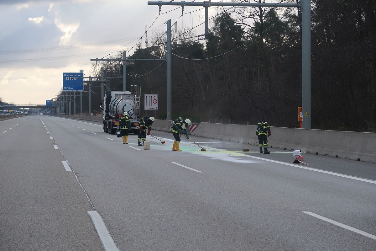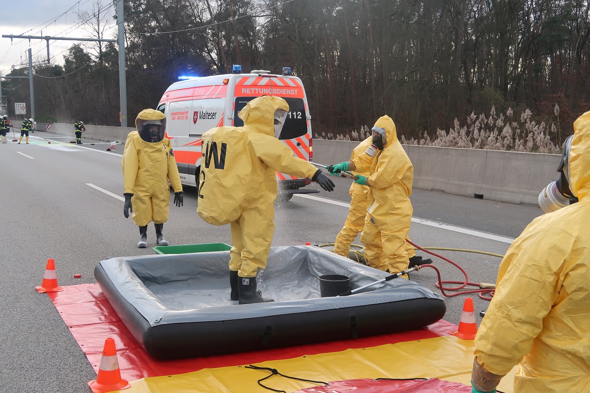Mitten im Stau trat bei einem Tankzug Salzsäure aus und verteilte sich auf der Fahrbahn. Die erst eintreffenden Kräfte sperrten den Gefahrenbereich großzügig ab und veranlassten eine Sperrung der Fahrbahngegenseite. Zum Glück handelte es sich nur um geringe Mengen Salzsäure die aus einem undichten Ventil aus dem Tank ausliefen. Die Feuerwehr dichtete unter Chemikalien Schutzanzügen das Leck ab und begann mit der Bindung und Aufnahme der ausgelaufenen Salzsäure. Auch wurde noch der benötigte Dekontaminationsplatz aufgebaut und in Betrieb genommen. Während des gesamten Einsatzes waren beide Fahrtrichtungen der BAB 5 voll gesperrt.