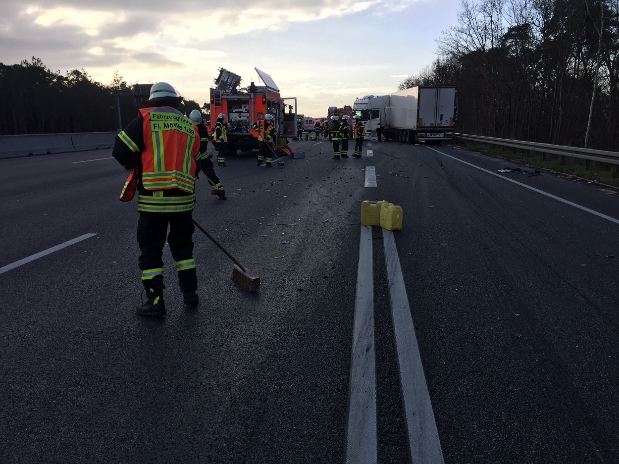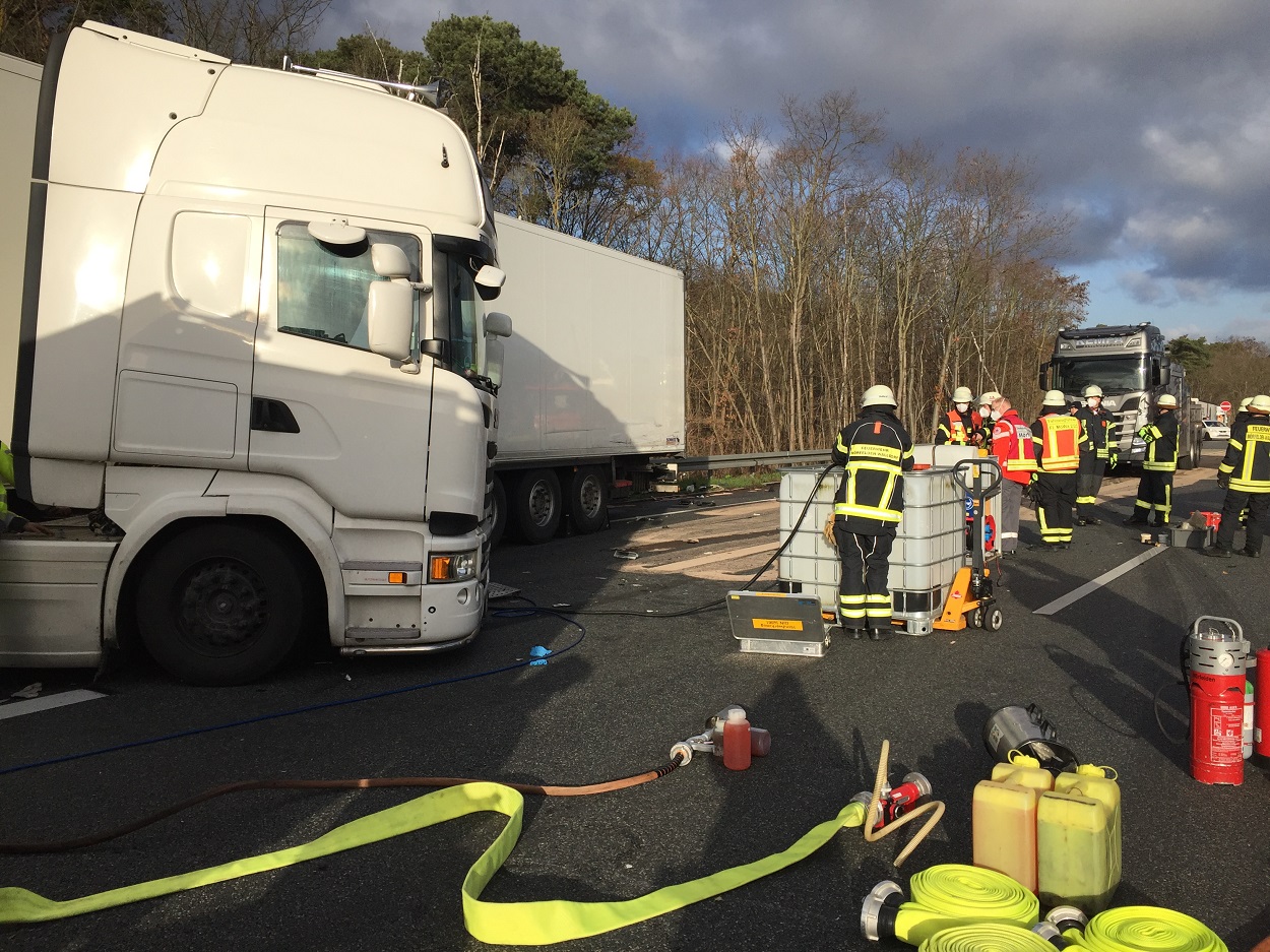 Die Feuerwehr Mörfelden-Walldorf wurde am Donnerstag um 09:44 Uhr zu einem Verkehrsunfall mit mehreren beteiligten Fahrzeugen auf die Bundesautobahn 5 in Fahrtrichtung Darmstadt alarmiert. Auf Höhe des Parkplatzes Brühlgraben stand ein verunfallter LKW auf der rechten Fahrbahn bei dem größere Mengen Diesel ausliefen. Die Einsatzstelle erstreckte sich auf ca. 500 Meter. Außerdem waren noch zwei weitere Fahrzeuge am Unfall beteiligt. Alle drei Insassen erlitten Verletzungen und wurden in umliegende Krankenhäuser abtransportiert. Die Feuerwehr sicherte die Unfallstelle ab und stellte sofort den Brandschutz sicher. Außerdem kümmerte man sich um die Aufnahme des ausgelaufenen Dieselkraftstoffes. Der Restkraftstoff aus dem beschädigten Tank musste teilweise noch abgepumpt werden. Anschließend konnte die Feuerwehr den Tank provisorisch abdichten.