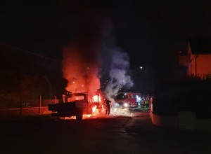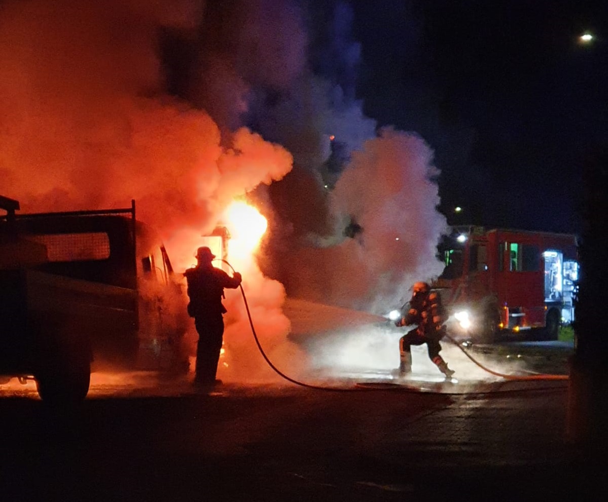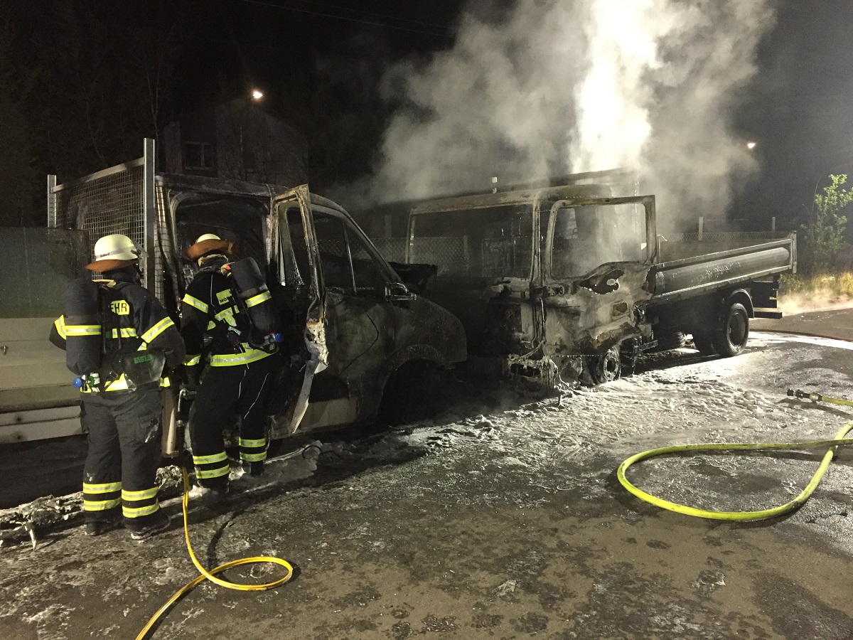 Um kurz nach Mitternacht wurde die Feuerwehr Walldorf am Mittwoch, den 14.04.2021 um 00:06 Uhr in die Reviolstraße alarmiert, dort brannten zwei abgestellte LKW´s. Vor Ort bestätigte sich die Lage, da ein LKW und ein Kleintransporter, jeweils im Cockpitbereich im Vollbrand standen.