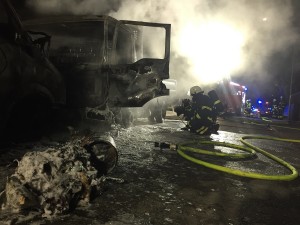 Sofort wurde durch die Feuerwehr ein Löschangriff unter Atemschutz eingeleitet um ein weiteres Ausbreiten der Flammen zu verhindern. Mithilfe von 2 C-Rohren konnten die Flammen schnell niedergeschlagen werden. Um in die Fahrzeugkabinen zu gelangen mussten die Türen mithilfe des Hydraulischen Rettungswerkzeuges aufgespreitzt werden. Im Anschluss wurden die Fahrzeuge mit einer Schaumdecke bedeckt, um alle Glutnester abzulöschen und ein erneutes Aufflammen zu verhindern.