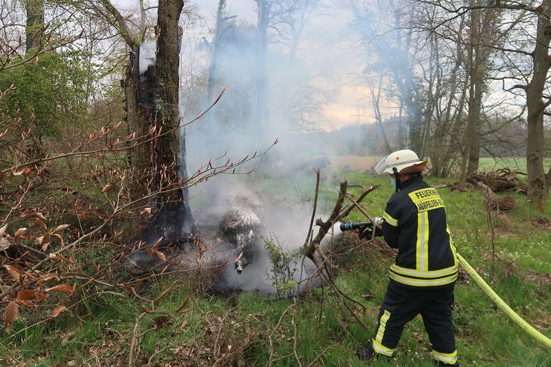 Die Feuerwehr Mörfelden-Walldorf wurde am Sonntag, den 02.05.2021 um 15:26 Uhr mit der Meldung brennt Baum und Wiese in der Nähe des Forstrettungspunkt 102 Helennenbrunnenschneise alarmiert. Beim Eintreffen brannte ein großer Eichenstamm in der Mitte und ca. 20 qm Wald- u. Wiesenfläche. Das Feuer wurde mit einem C-Rohr abgelöscht. Weil der hohle Baum im Inneren brannte, musste dieser mit der Kettensäge aufgeschnitten werden um restliche Glutnester ablöschen zu können. Warum der Baum brannte ist Bestandteil der polizeilichen Ermittlungen. Es waren 5 Fahrzeuge mit 14 Einsatzkräfte ausgerückt.