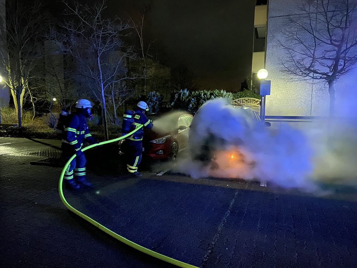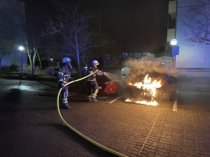Am frühen Sonntagmorgen um 04:30 Uhr wurde die Feuerwehr Walldorf zu einem gemeldeten Fahrzeugbrand in die Aschaffenburgerstraße alarmiert. Laut der Erstmeldung sollte sich das Fahrzeug in einem Parkhaus befinden. Aus diesem Grund wurde das Alarmstichwort erhöht und weitere Einsatzkräfte mithilfe der Sirene nachalarmiert. Vor Ort stellte sich heraus, dass das brennende Fahrzeug nicht im Parkhaus, sondern neben dem Parkhaus abgestellt war. Sofort ging ein Trupp unter Atemschutz vor und konnte das Feuer in kürzester Zeit löschen. Im Anschluss wurde die Heckklappe geöffnet und der Innenraum mithilfe der Wärmebildkamera kontrolliert.