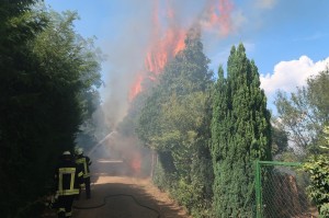 Die Feuerwehr Mörfelden wurde am Sonntag, den 8.7.2018 um 15:44 Uhr mit der Meldung brennt Grasfläche Rembrandtstr. alarmiert. Während der Anfahrt zur Einsatzstelle kam die Rückmeldung von der Leitstelle das die Flammen auf das Gebäude übergreifen würden. Daraufhin wurde das Alarmstichwort auf Feuer 2 erhöht. Beim Eintreffen an der Einsatzstelle hatten die Anwohner bereits das Feuer mit Gartenschläuchen gelöscht. Von der Feuerwehr wurden nur noch mit einem C-Rohr Nachlöscharbeiten durchgeführt. Von der Feuerwehr Mörfelden-Walldorf rückten 6 Fahrzeuge mit 28 Einsatzkräften aus.