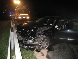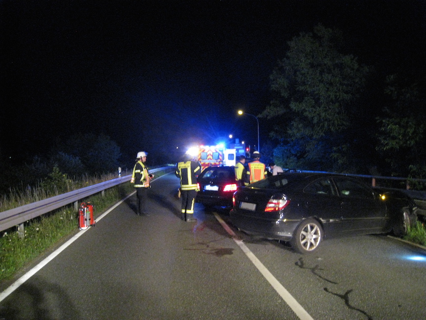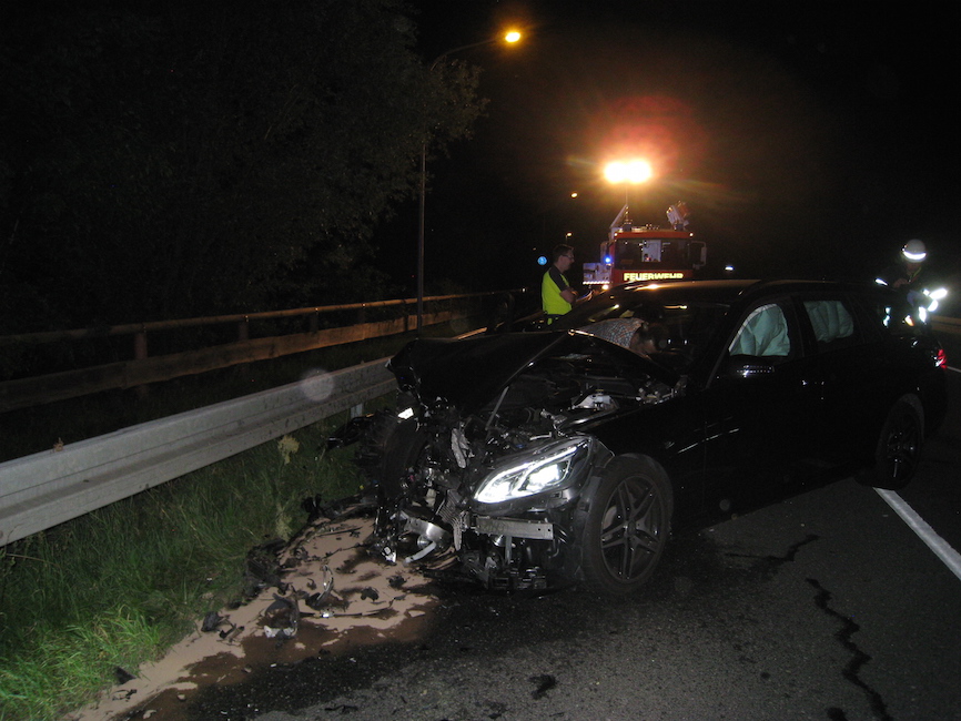 Zum vierten Mal innerhalb von 12 Stunden wurde die Walldorfer Wehr alarmiert. Erneut ereignete sich ein Verkehrsunfall. Dieses Mal ging es für die Einsatzkräfte auf die Wageninger Straße. Dort kollidierten zwei Fahrzeuge Frontal miteinander. Beide Insassen wurden bereits beim Eintreffen der Feuerwehr vom Rettungsdienst behandelt. Die Feuerwehr sicherte die Einsatzstelle ab, klemmte die Batterien der Fahrzeuge ab, stellte den Brandschutz sicher und nahm die ausgelaufenen Betriebsstoffe mithilfe von Bindemittel auf. Die Wageninger Straße war über den kompletten Einsatz gesperrt. Um 05:37 Uhr war der Einsatz für die Feuerwehr beendet.