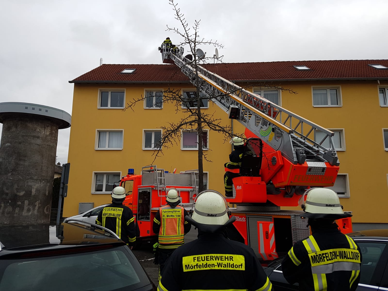 Am Samstag wurde die Drehleiter aus Walldorf zur Unterstützung der Mörfelder Kameraden in die Turnstraße gerufen. Dort drohte eine Satelittenschüssel von einem Dach eines Mehrfamilienhauses zu stürzen. Die Feuerwehr entfernte Mithilfe der Drehleiter die Satelittenschüssel vom Dach.
