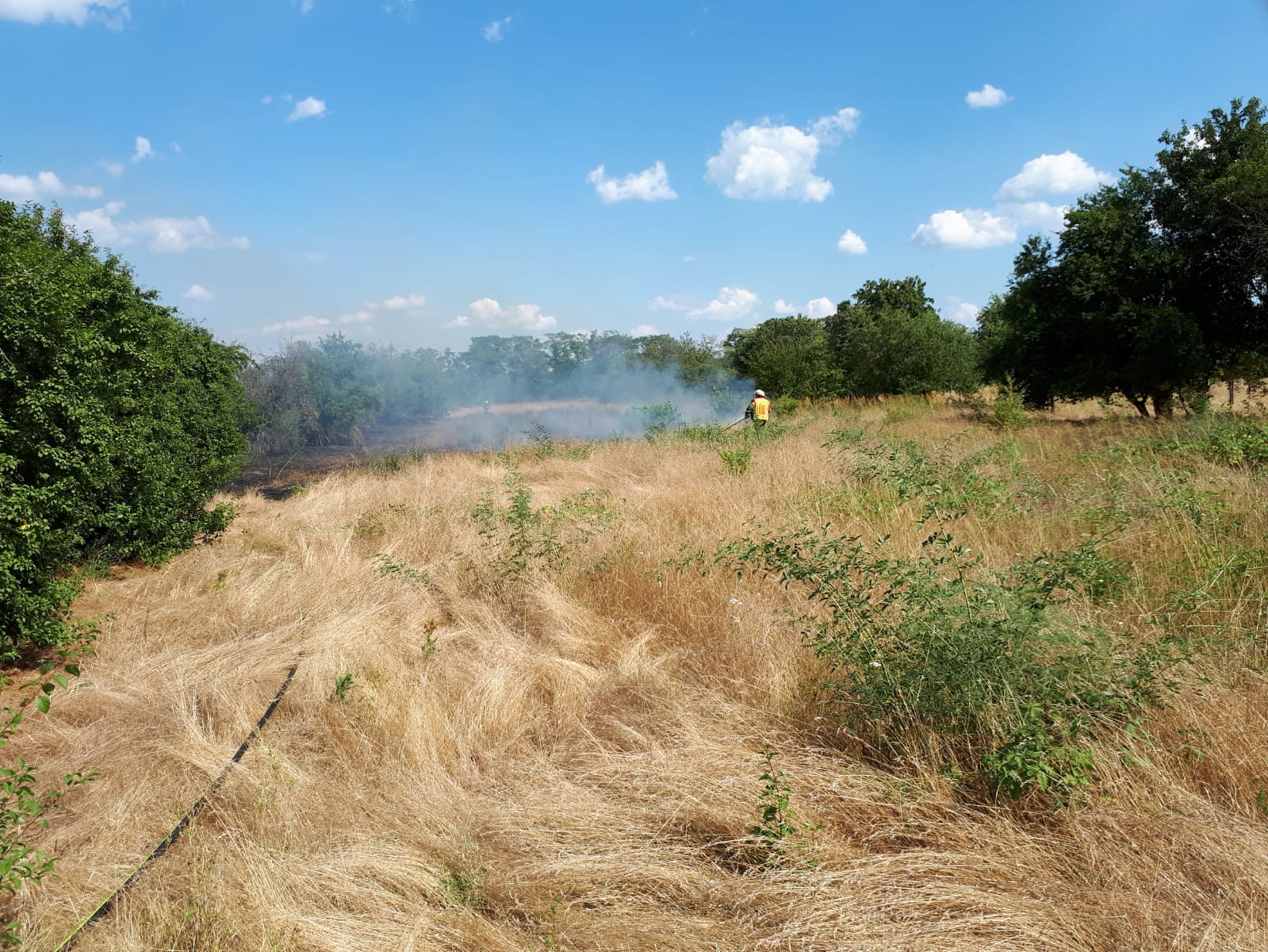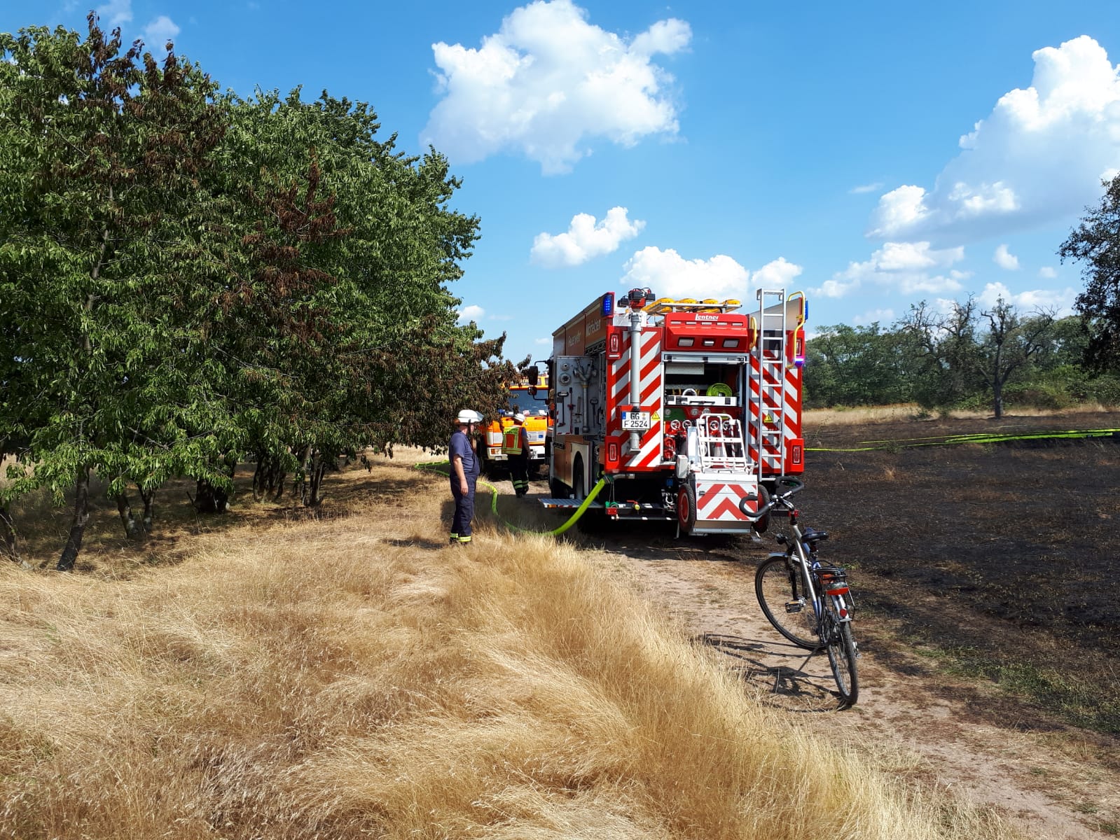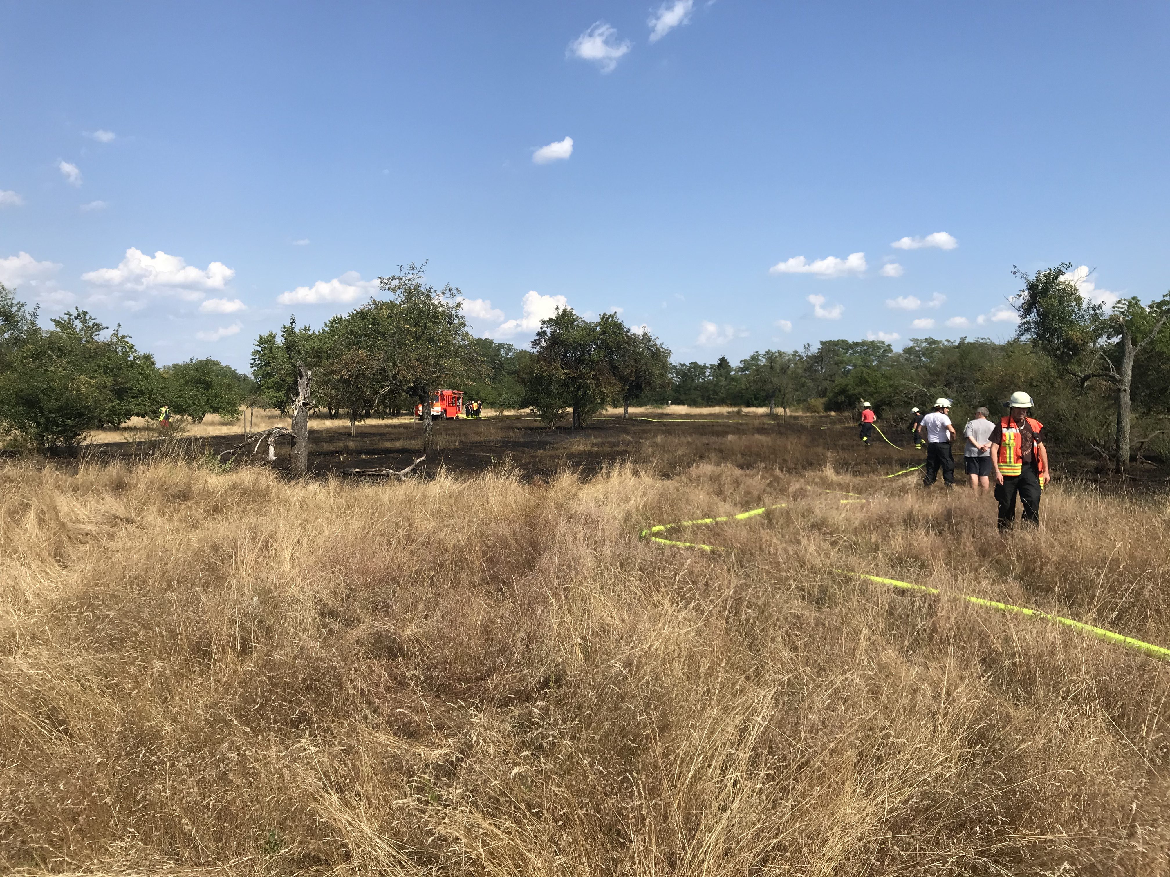 Zum zweiten Einsatz an diesem Dienstag wurde die Feuerwehr Walldorf um 15:32 Uhr zu einem Flächenbrand an der Wageninger Straße alarmiert. Vor Ort brannten ca. 2000 Quadratmeter Wiese. Sofort wurde die Feuerwehr Mörfelden mit ihren beiden Tanklöschfahrzeugen zur Unterstützung nachalarmiert. Mit insgesamt 6 Strahlrohren wurde der Brand bekämpft und nach kurzer Zeit konnte Feuer aus gemeldet werden. Anschließend wurden ausführliche Nachlöscharbeiten durchgeführt. Beide Feuerwehren waren mit 8 Fahrzeugen 35 Mann vor Ort.