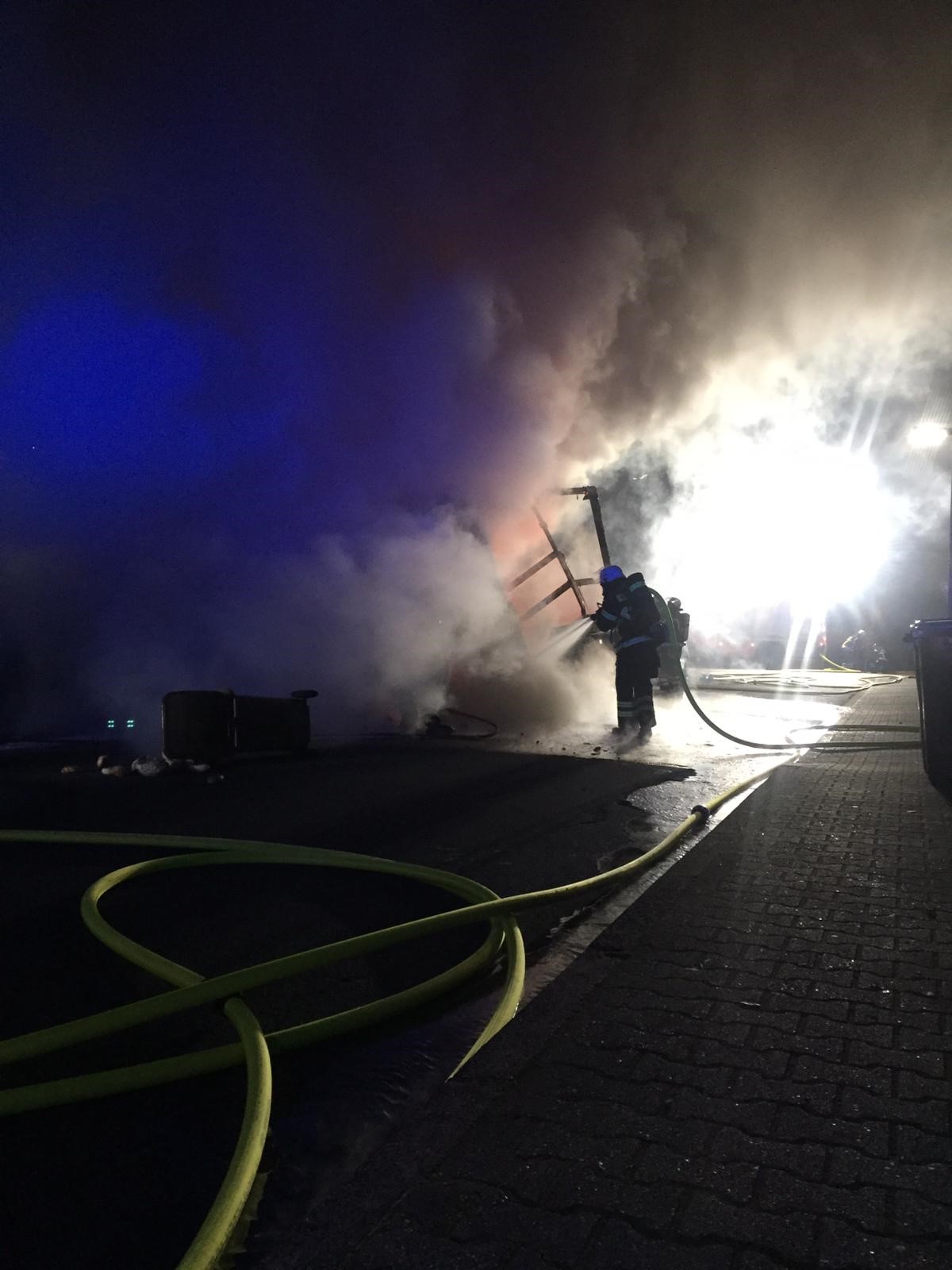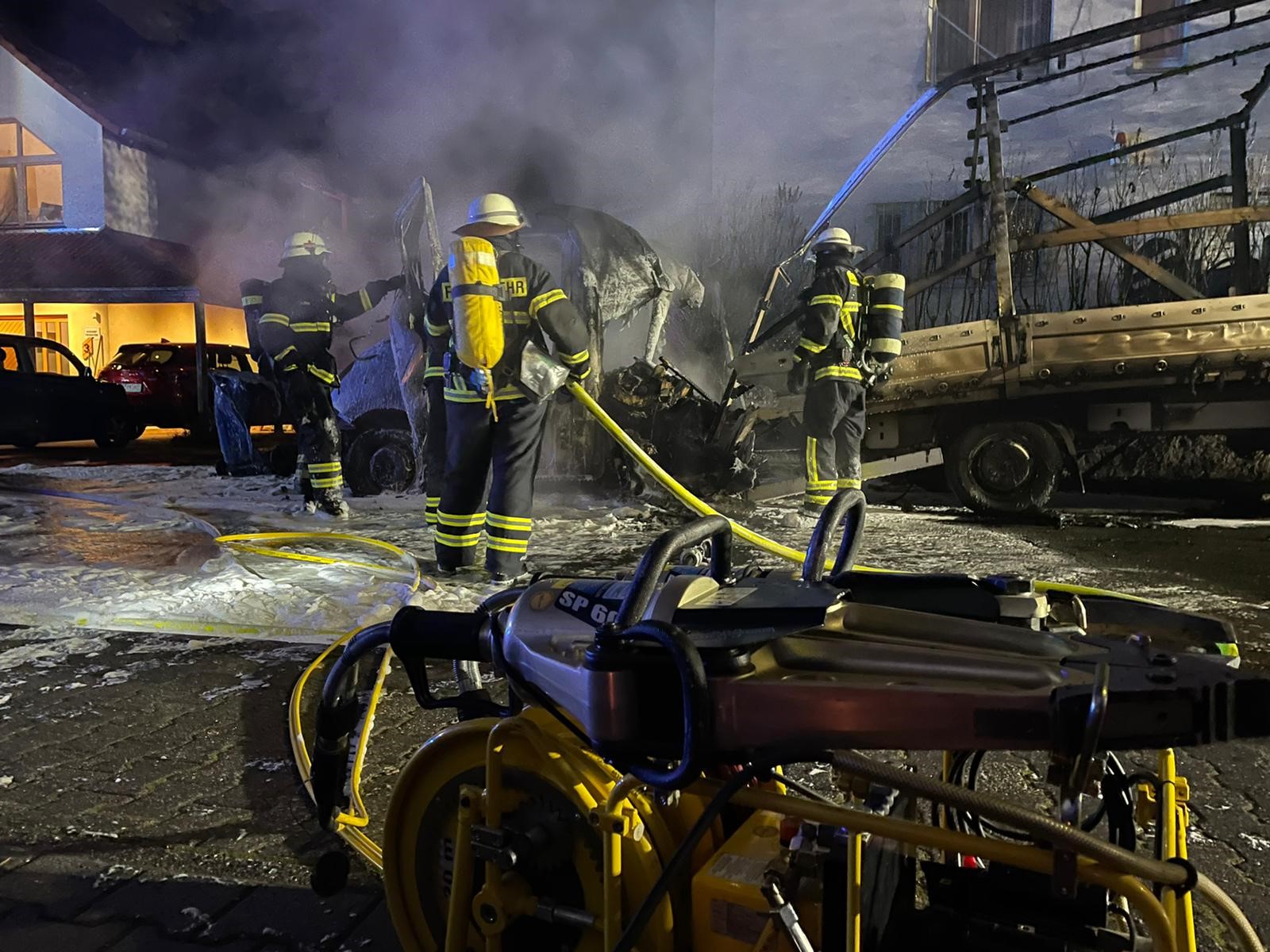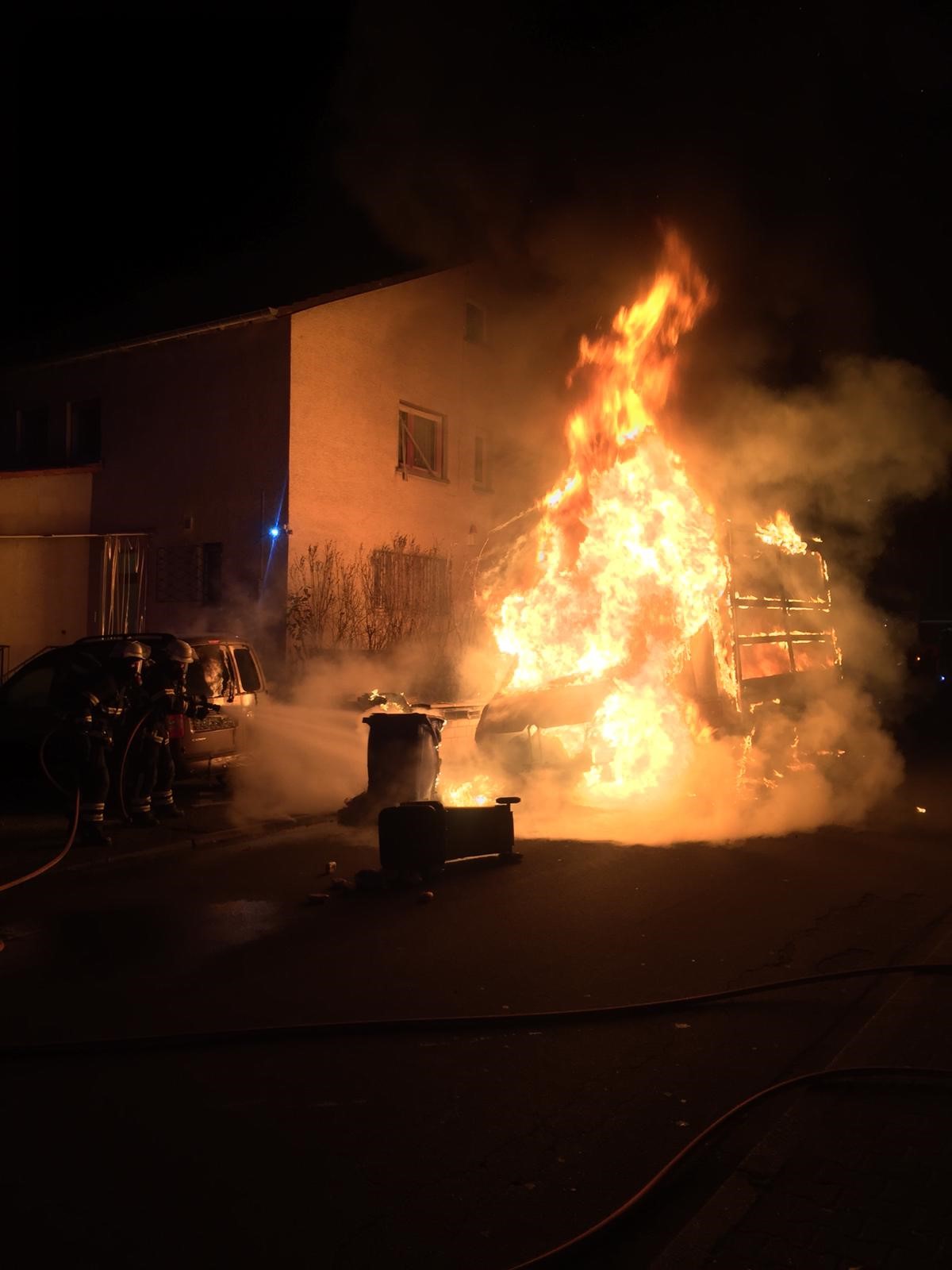 Der Kleintransporter brannte komplett aus, zwei weitere Fahrzeuge, das Fenster eines angrenzenden Wohnhauses, eine Mülltonne sowie der Straßenbelag wurden in Mitleidenschaft gezogen. Gegen 01:25 Uhr waren alle Fahrzeuge wieder Einsatzbereit in der Unterkunft.