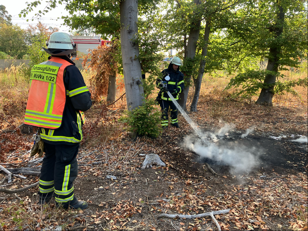 Die Feuerwehr Mörfelden-Walldorf wurde am Sonntag, den 28.08.2022 um 09:05 Uhr zu einem Flächenbrand im Waldstück zwischen dem Zeltplatz und der A 5 alarmiert. Die Polizei war bereits vor Ort, beim Eintreffen war der Brand auf einer Fläche von ca. 5m² bereits gelöscht. Die Einsatzkräfte führten Nachlöscharbeiten durch und konnten den Einsatz anschließend beenden. Im Einsatz war die Feuerwehr Mörfelden-Walldorf mit fünf Fahrzeugen und 23 Einsatzkräften.