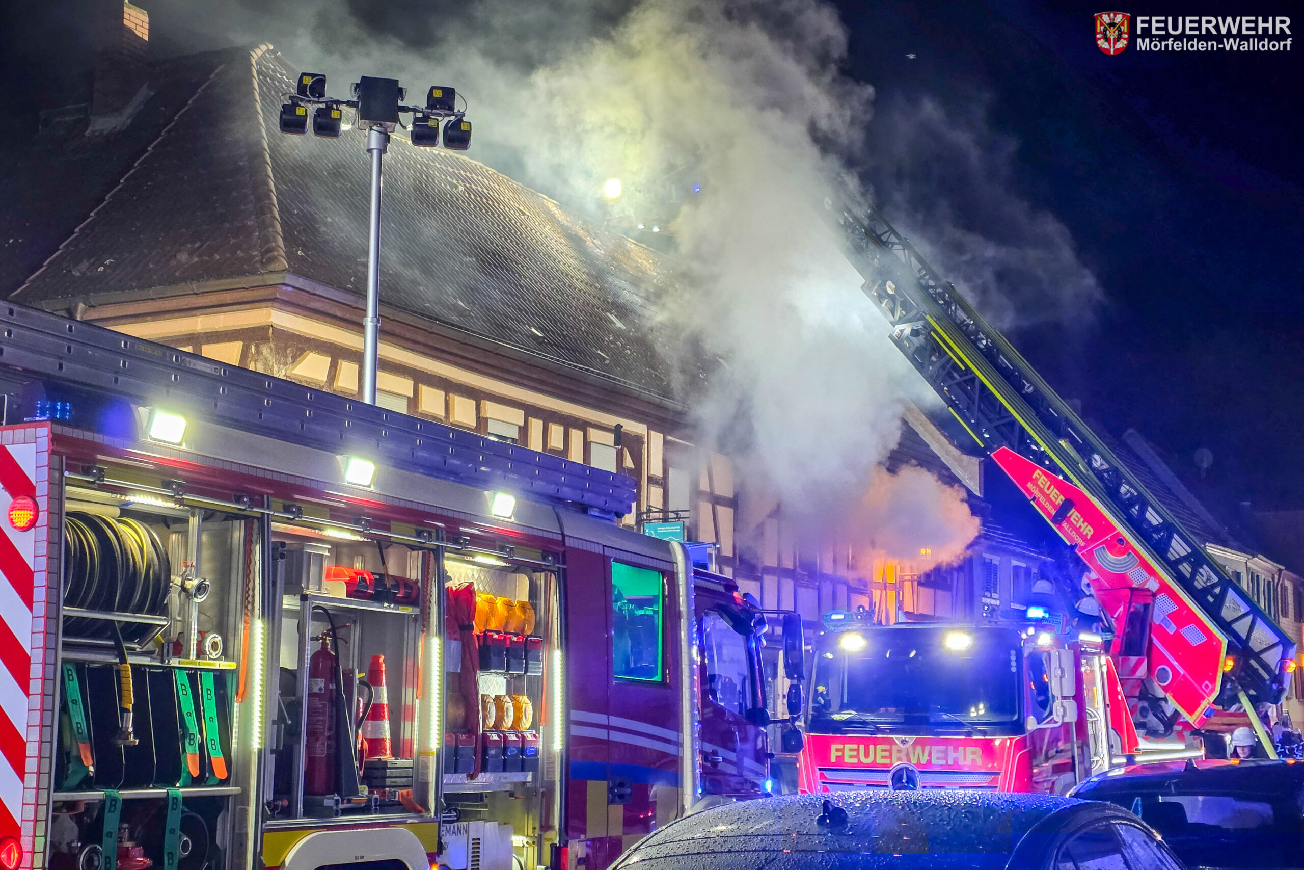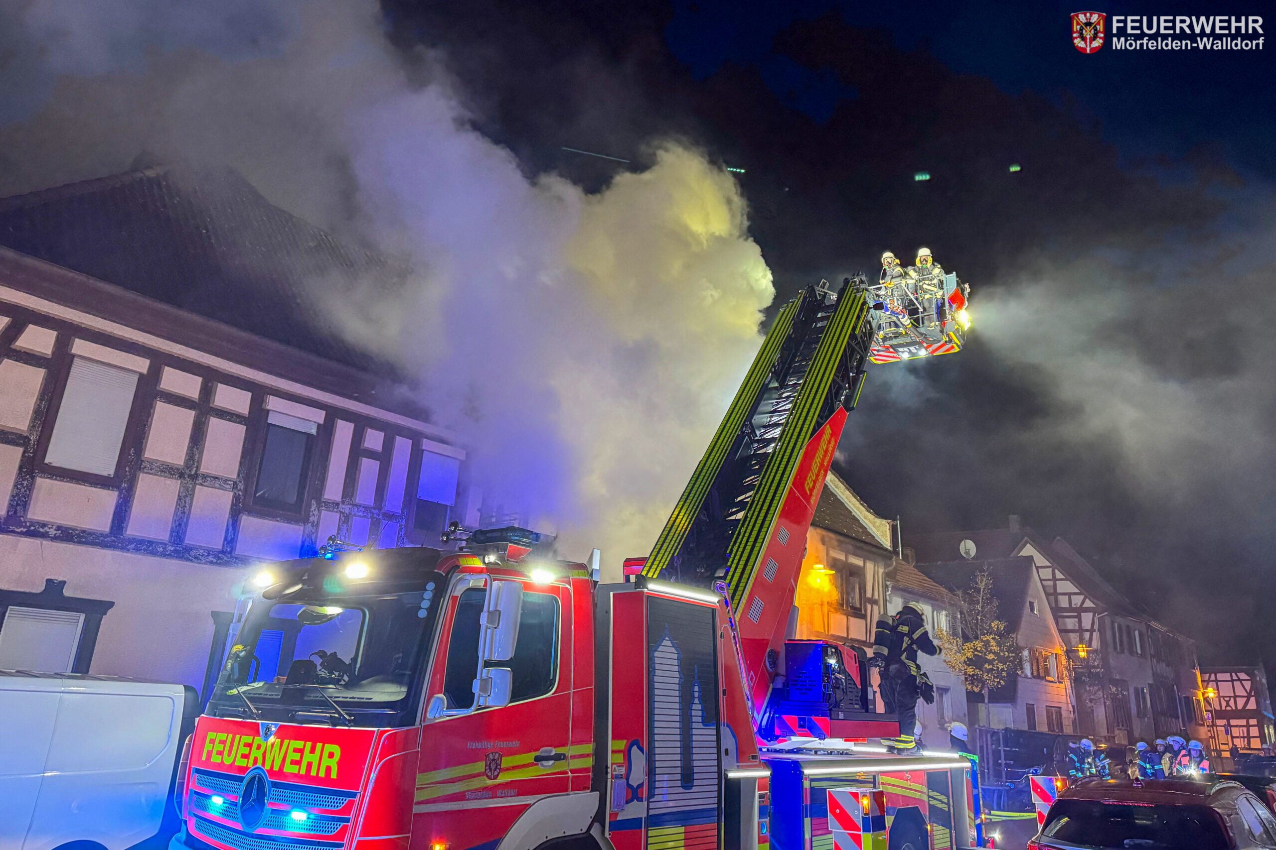 Somit konnten sich die Einsatzkräfte auf die Brandbekämpfung konzentrieren und ein Trupp unter Atemschutz ging umgehend vor, um das Feuer zu löschen. Der Brand hatte sich rasant ausgebreitet, sodass schon im Flur den Feuerwehrleuten Flammen entgegenschlugen und ein weiteres Vorgehen aufgrund der enormen Hitze nicht möglich war. Kurze Zeit später kam es zu einer Rauchgasdurchzündung, welche einen Rückzug erforderlich machte. Nachdem der Brand mit zwei Strahlrohren im Außenangriff und über die Drehleiter eingedämmt wurde, konnte der Innenangriff fortgesetzt werden. Da weitere Atemschutzgeräteträger benötigt wurden und sich der Brand auf Teile des Dachs ausgebreitet hatte, wurde zur Unterstützung ein weiterer Löschzug von den Feuerwehren aus Groß-Gerau und Büttelborn angefordert. Gemeinsam mit den Kameraden gelang es den Brand einzudämmen, sodass um 04:35 Uhr Feuer aus gemeldet werden konnte.